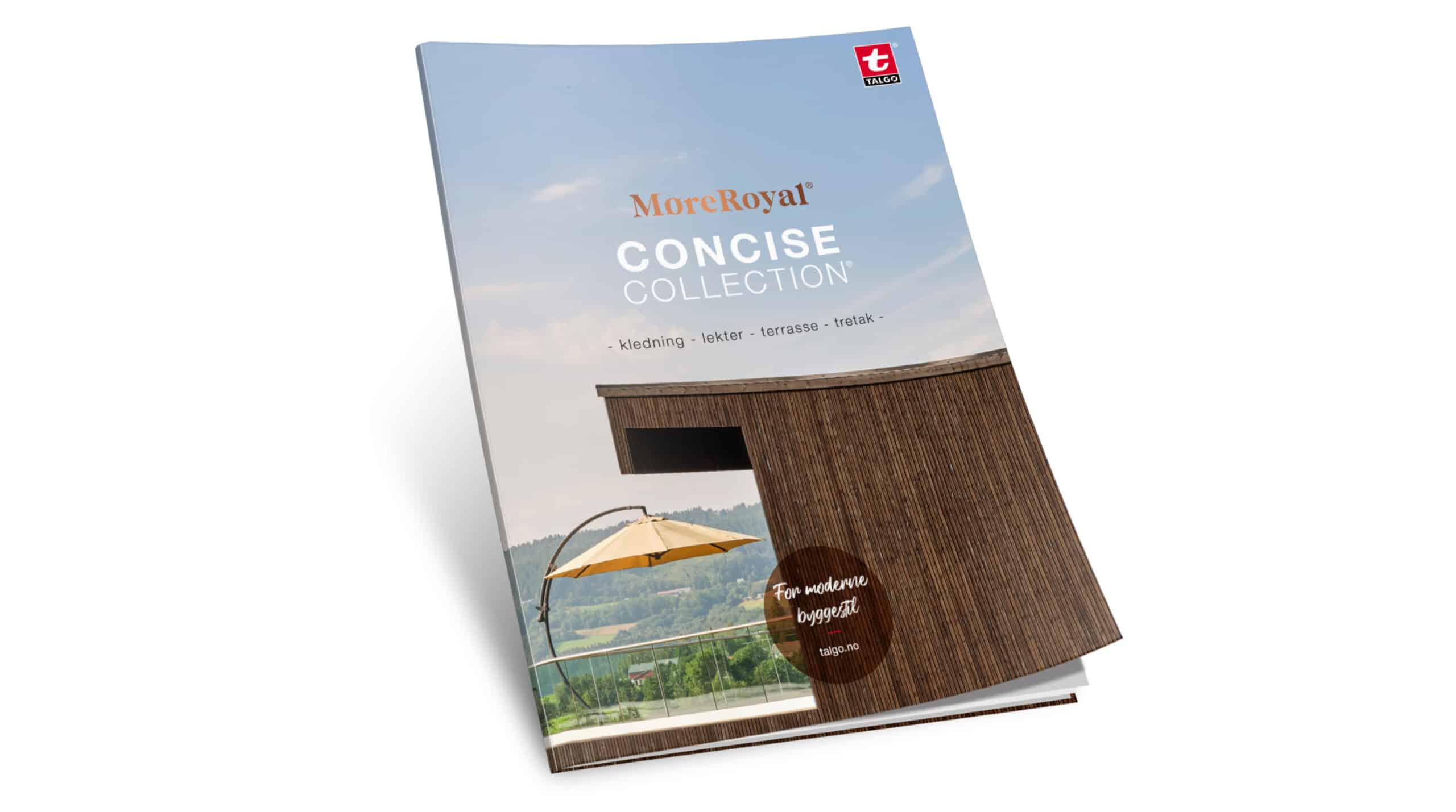 Med et stadig voksende marked for funkisboliger og moderne hus har vi utviklet kolleksjonen Concise Collection. En serie med royalimpregnerte produkter til moderne arkitektur med rette linjer og skarpe kanter for et strammere uttrykk. En liten fas i hjørnet hindrer flising. Alle produktene har sawcut, en spesialbehandlet overflate som gir en børstet følelse, mindre fiberreisning og jevnere fargeheft. Finnes som kledning, terrassebord, tretak, fasadelekter og altanrekke.