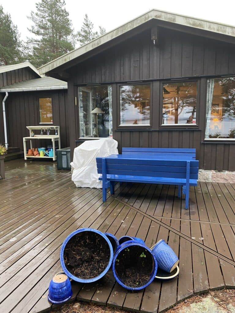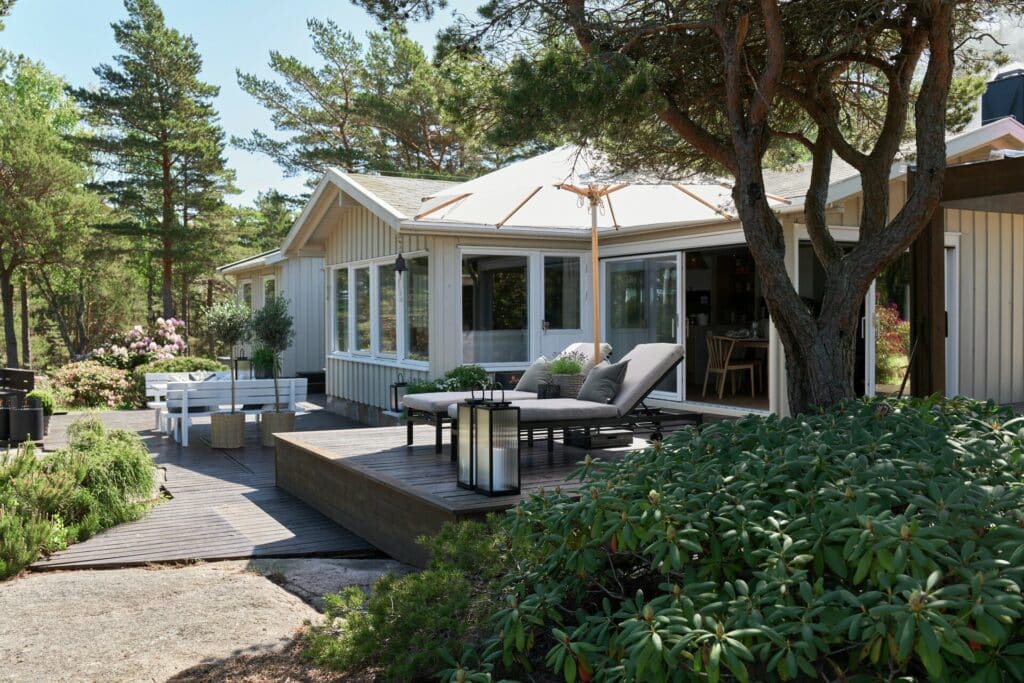 Utendørs var det en gammel, halvråtten pergola som sårt trengte et ansiktsløft. I likhet med resten av hytta var målet å få pergolaen mer i harmoni med omgivelsene, i dette tilfellet furuskogen som omkranser hytta.