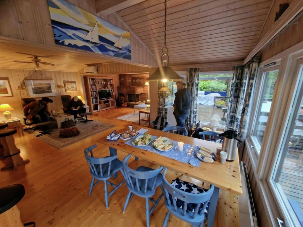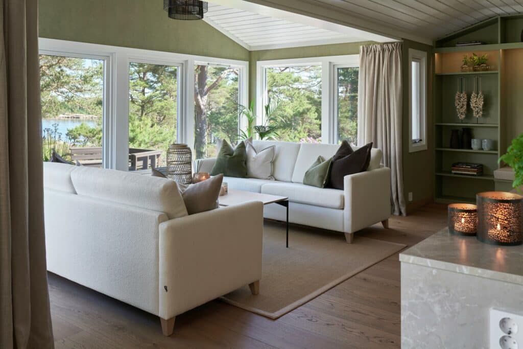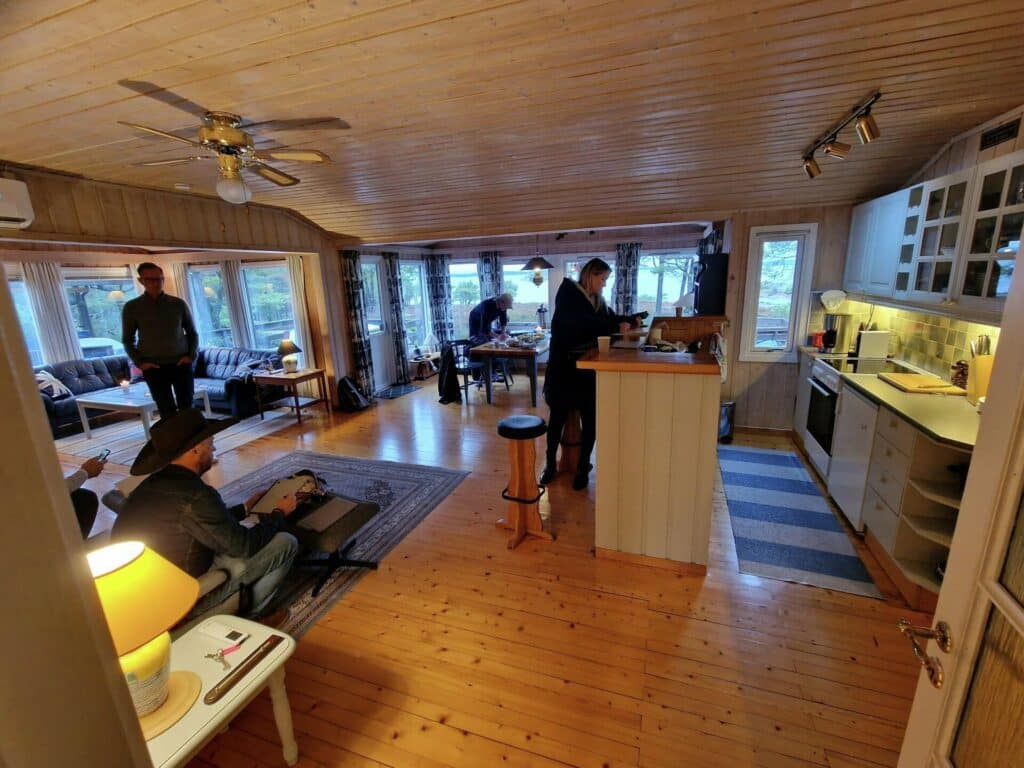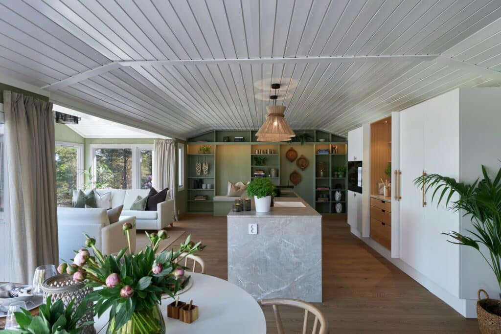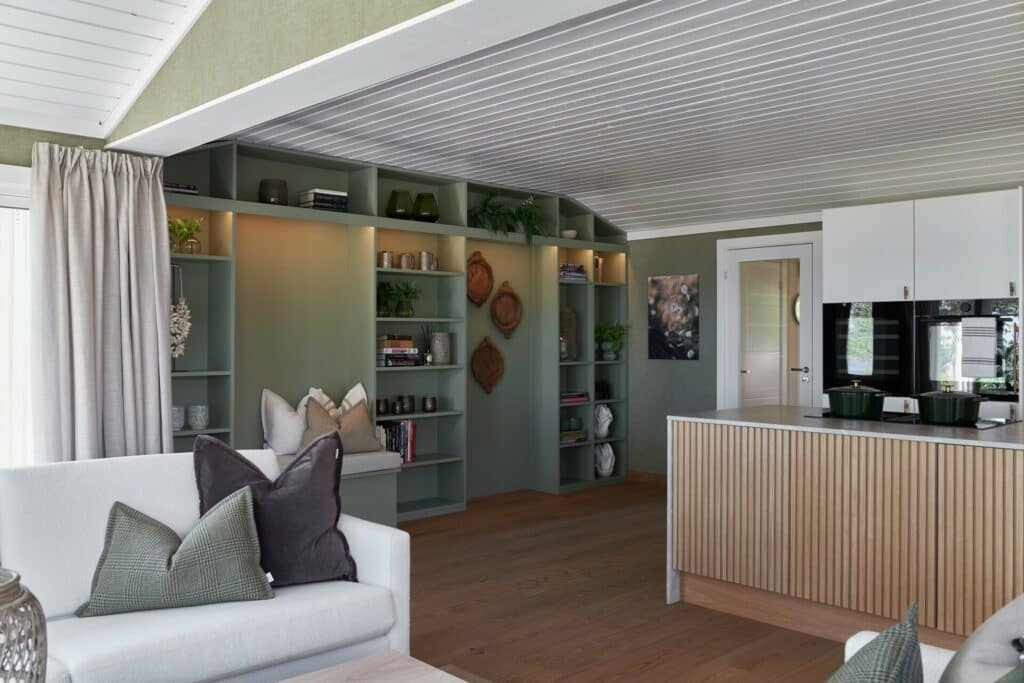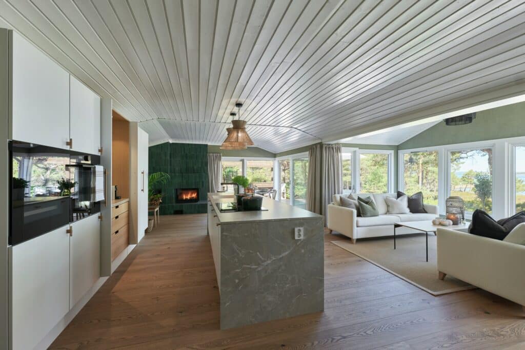 Det gir også noe å sikte etter for resten av hytta. Store, nye høyskap på kjøkkenet plasseres inn mot bakveggen, mens en ny kjøkkenøy settes opp slik at man kan tilberede mat med utsikt ut mot sjøen. Spisestuen og den nye, plassbygde bokhyllen designes også slik at utsikten stråler mot en.