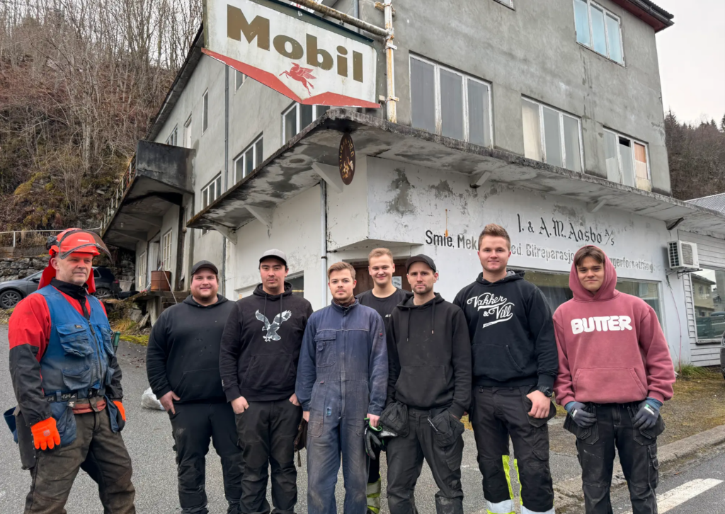 Nordmøre Gatebilklubb, her ved Tore Mo (f.v.), Harald Bæverfjord Ranheim, Ole Vikavoll, Erlend Sæthervik, Aron Telstad Sollid, Erik Nordvik Sæter, Sindre Humberset og Lars Kristoffer Kårvatn Moen, har begynt arbeidet med å gjøre deler av «Aasbø-smiå» i Surnadalsøra 55 til klubbhus. Foto: Øystein Hjelle Bondhus / Driva