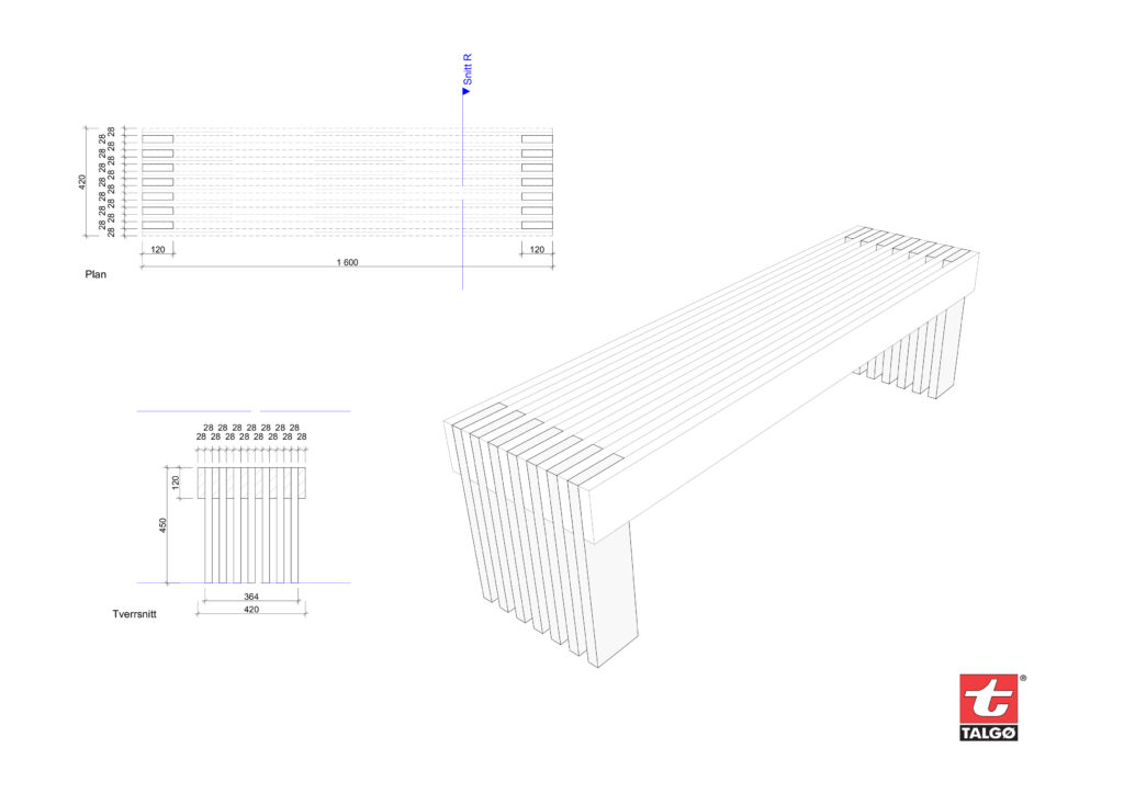 8 stk. terrassebord 28×120, lengde 160 cm til sete, legges på høykant og skrues sammen med 7 stk. stående terrassebord 28×120, lengde 45 cm, til bein i hver ende av de liggende terrassebordene.