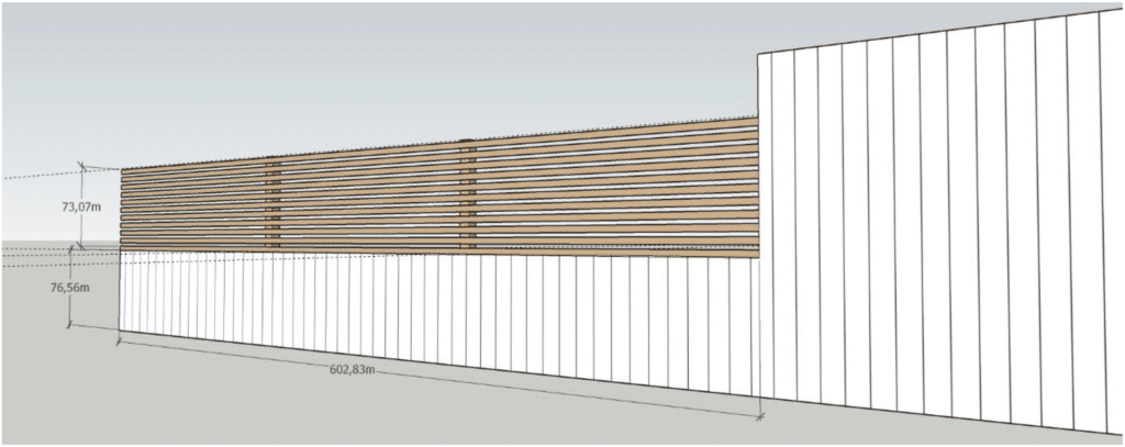 Deretter monterte vi lange lekter i 34×45 mm liggende langs stolpene. Vi la avstand med én lekt mellomrom ovenfra og ned.