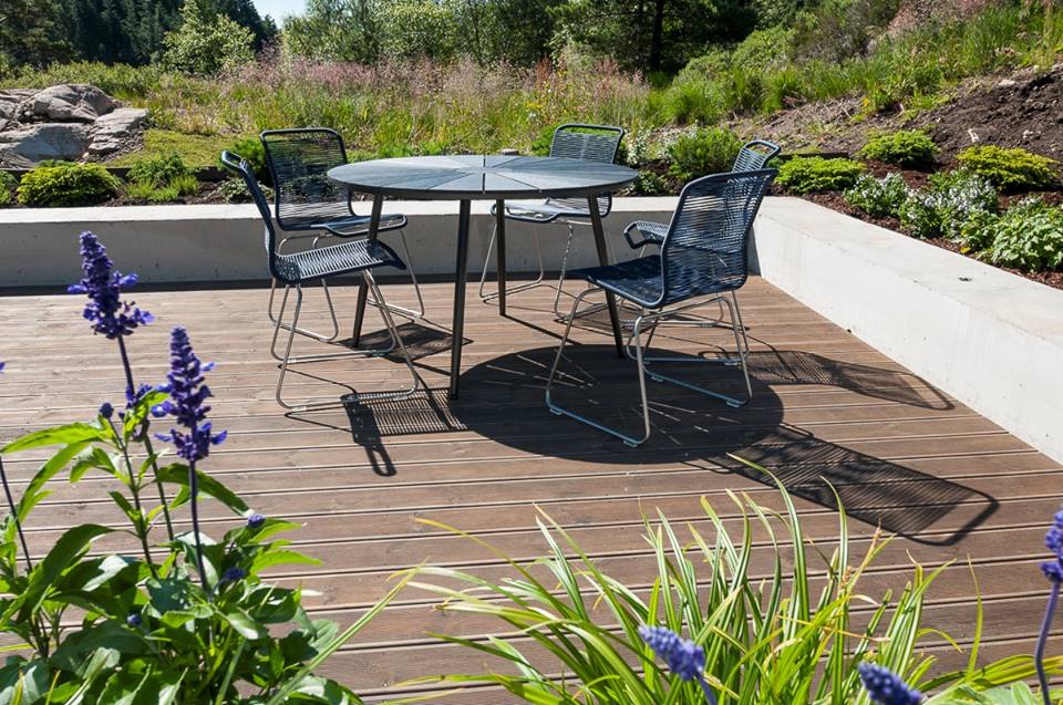 Med utgangspunkt i et flott hus med MøreRoyal® grå kledning fulgte alltid kreative Kjersti Bergesen opp med et hagedesign der terrassebord grå i MøreRoyal® UNO med rill ble omkranset av store murbed, steiner, vannspeil og beplanting, nivåforskjeller og skjerming. En herlig uteplass for både store og små!