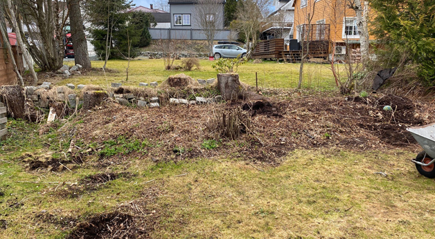 Tomten har tidligere vært dekket av store trær og planter som har fått vokse fritt. Det hadde medført at et hjørne av tomten i stor grad bestod av stubber, nypebusker og et viltvoksende ugress. Her måtte noe gjøres.