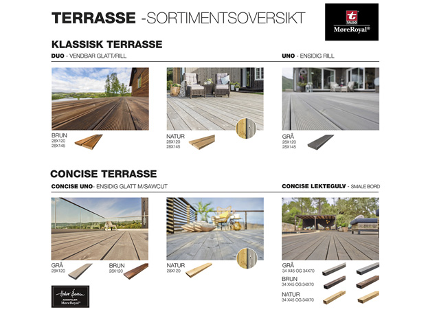 Et tregulv i MøreRoyal® er et godt valg både for deg og miljøet, og det er lett å finne gode grunner til å plukke fra nettopp denne hylla når du skal velge dekke til uteplassen din. Med mange fargealternativer, profiler, bredder og stilarter skulle det meste ligge til rette for at du finner et terrassegulv i MøreRoyal® som passer akkurat din stil. Du får god hjelp hos byggevareforhandleren.