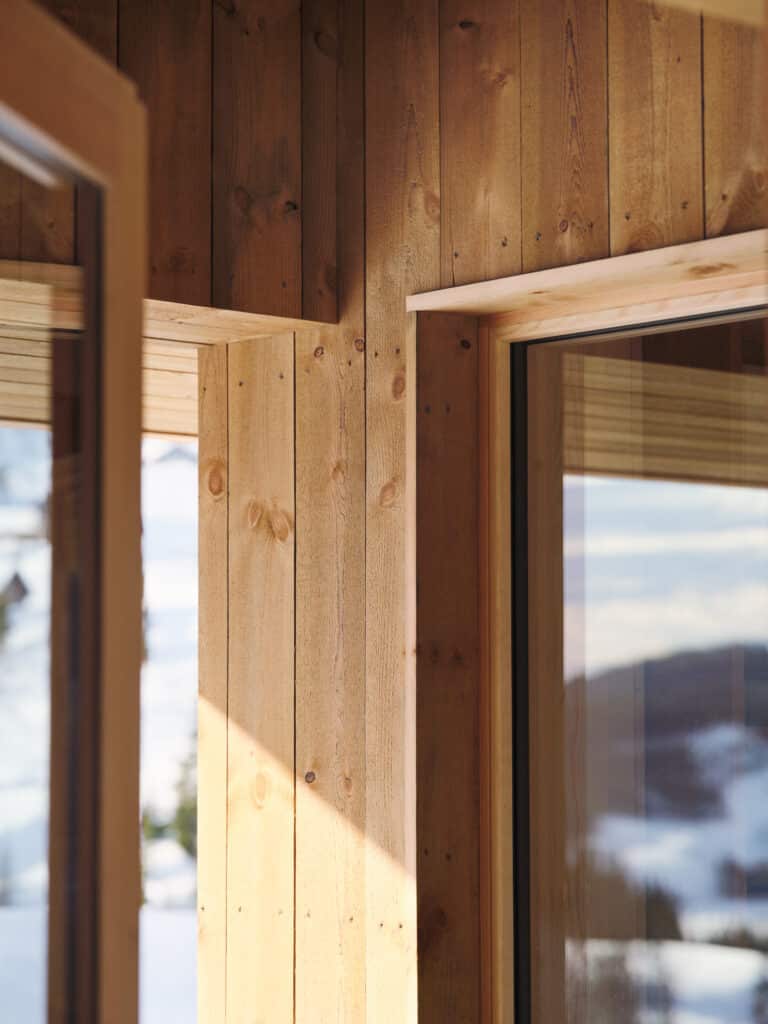 Kledningen på hytta er dobbelfals tett i fargen natur. Dobbelfals tett er en profil som gir en slett, homogen flate, uten faser og skygger. Profilen har en rett fals på begge sider, og gir et strammere og mer moderne uttrykk.