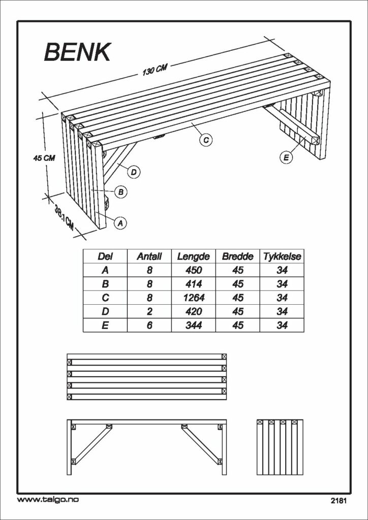 3) Ben: Legg annenhver A- og B-lekt med 3 mm mellomrom og skru E-lekter oppå, som vist på tegning.