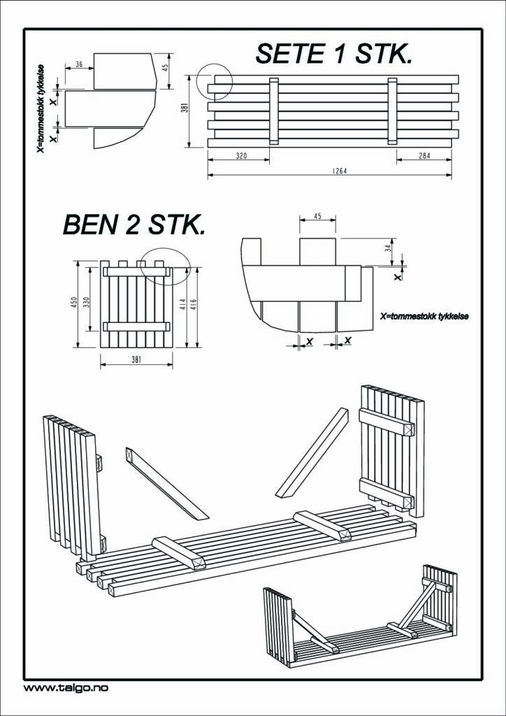 4) Sett sammen ben med benk og skru med 4,4×72 syrefaste fasadeskruer gjennom lekt E inn i C-lekt.