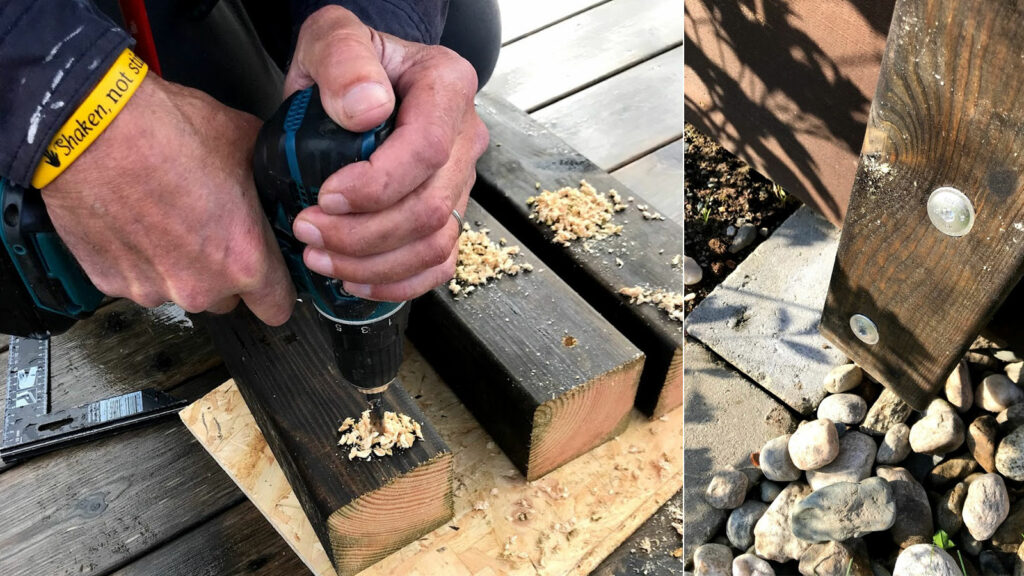 Så forboret vi hull til de kraftige skruene, og satte søylene med 120 cm mellomrom. Det ble så tatt mål fra ytterside til ytterside, så kappet vi og skrudde fast en toppbjelke. Vi gjentok det samme på den andre siden. Til slutt tok vi mål fra innside til innside av de to motstående veggene slik at vi fikk kappet og satt på toppbjelker på tvers. Her anbefaler jeg deg å høre med fagfolk slik at du får både skruer og festemekanismer som passer til hagen din. Jeg var heldig og kunne forankre pergolaen i den eksisterende platten.
