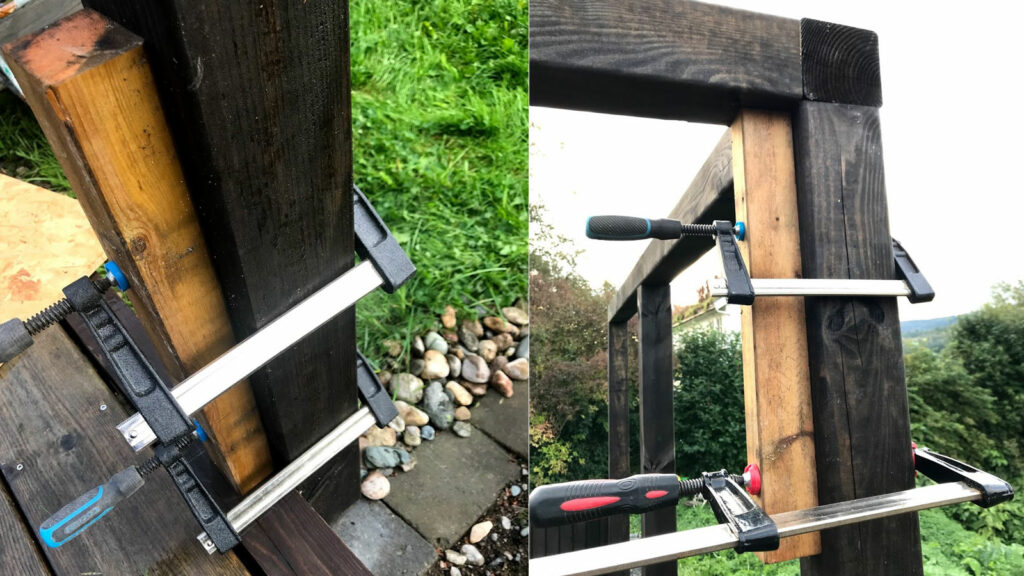 Vi brukte klemmer med støttebiter slik at det ikke ble så tunge løft når toppdragerene skulle skrues fast i toppen.