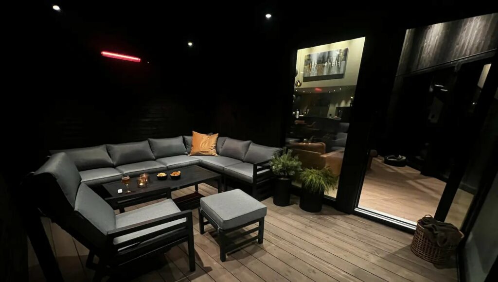 Visningshytten med endeplassering har fått MøreRoyal dobbelfals kledning og terrassebord i bred dimensjon fra Concise Collection. Dette er en serie med royalimpregnerte produkter til moderne arkitektur med rette linjer og skarpe kanter for et strammere uttrykk. En liten fas i hjørnet hindrer flising, og alle produktene har sawcut – en spesialbehandlet overflate som gir en børstet følelse, mindre fiberreisning og jevnere fargeheft.