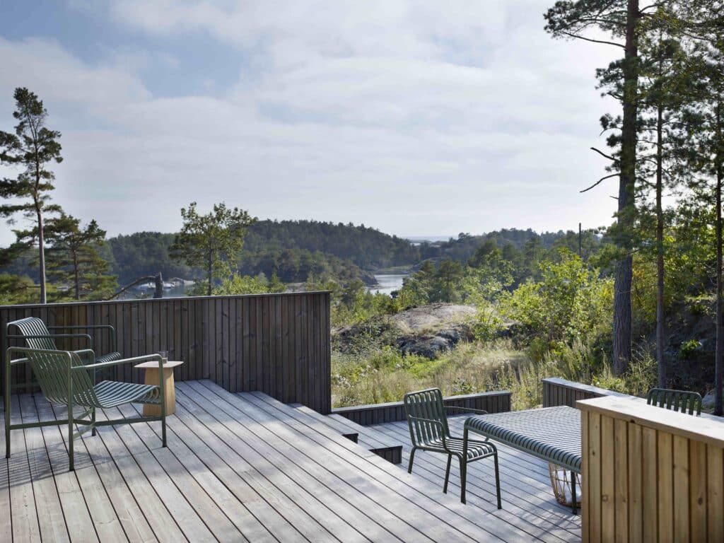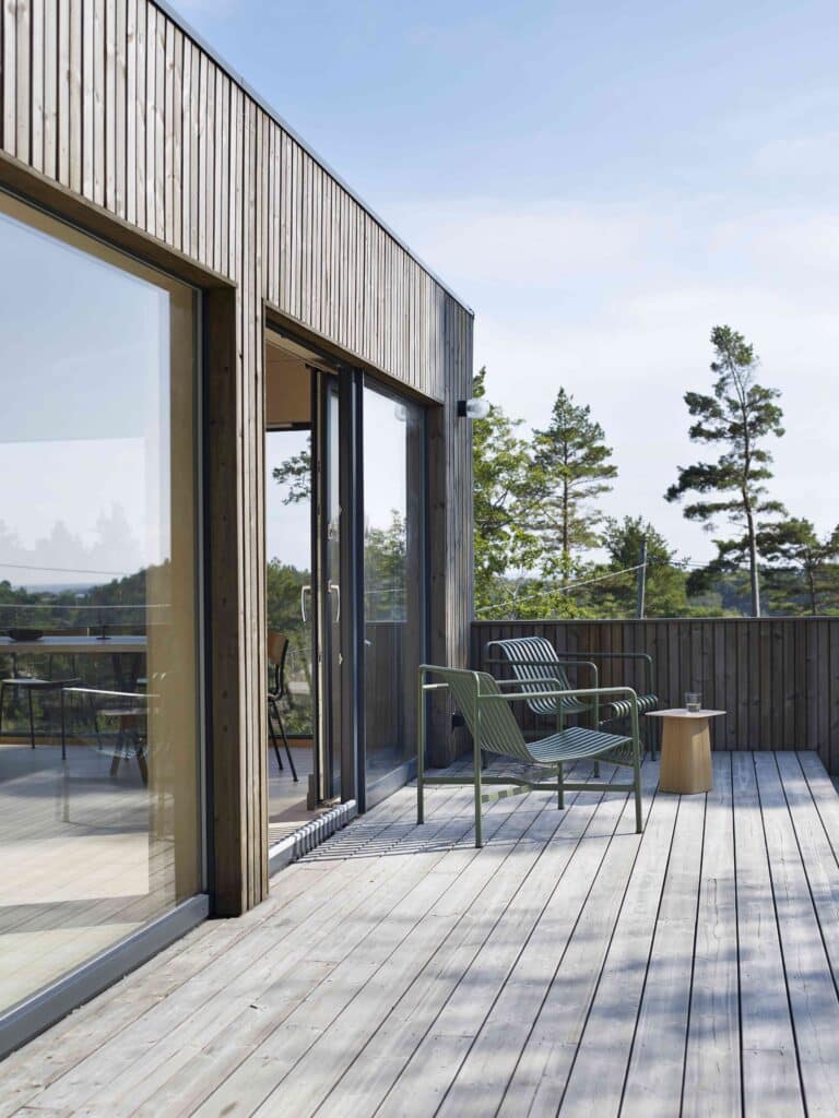 Utendørs er også konstruksjon og utforming nøye gjennomtenkt. Moderne kvalitetsmaterialer ble valgt for et vakkert uttrykk som går hånd i hånd med lite vedlikeholdsbehov. Kledningen er holdt i MøreRoyal Natur, som vil gråne over tid. Med en værbitt, sølvgrå fasade utformet av tidens tann vil hytta gli helt naturlig inn i omgivelsene. Fasaden følger terrenget med kledning kappet i ulik høyde tilpasset bølgende bergknauser, og terrassearealer i ulike nivåer.