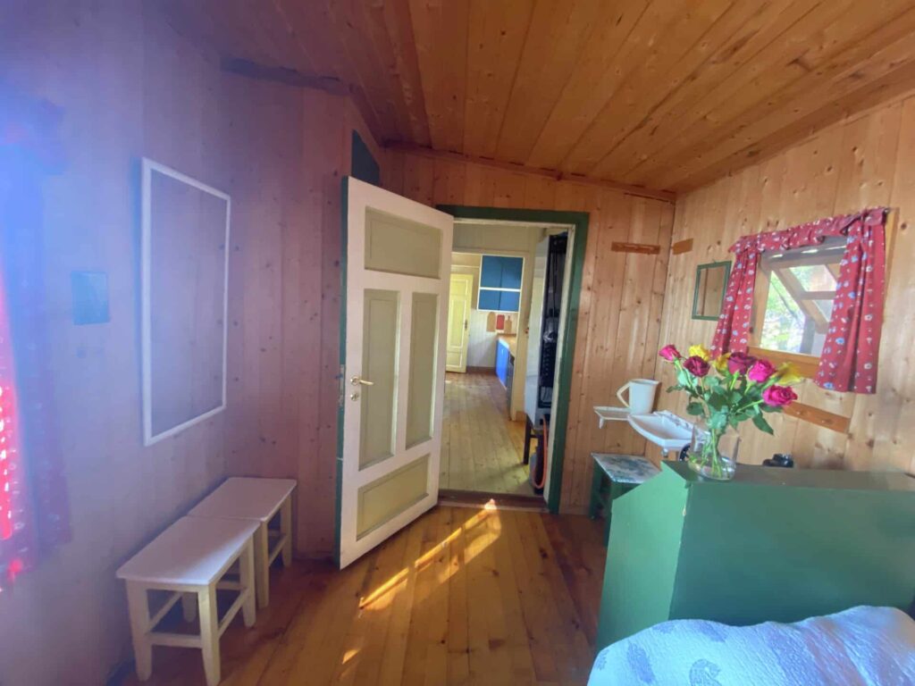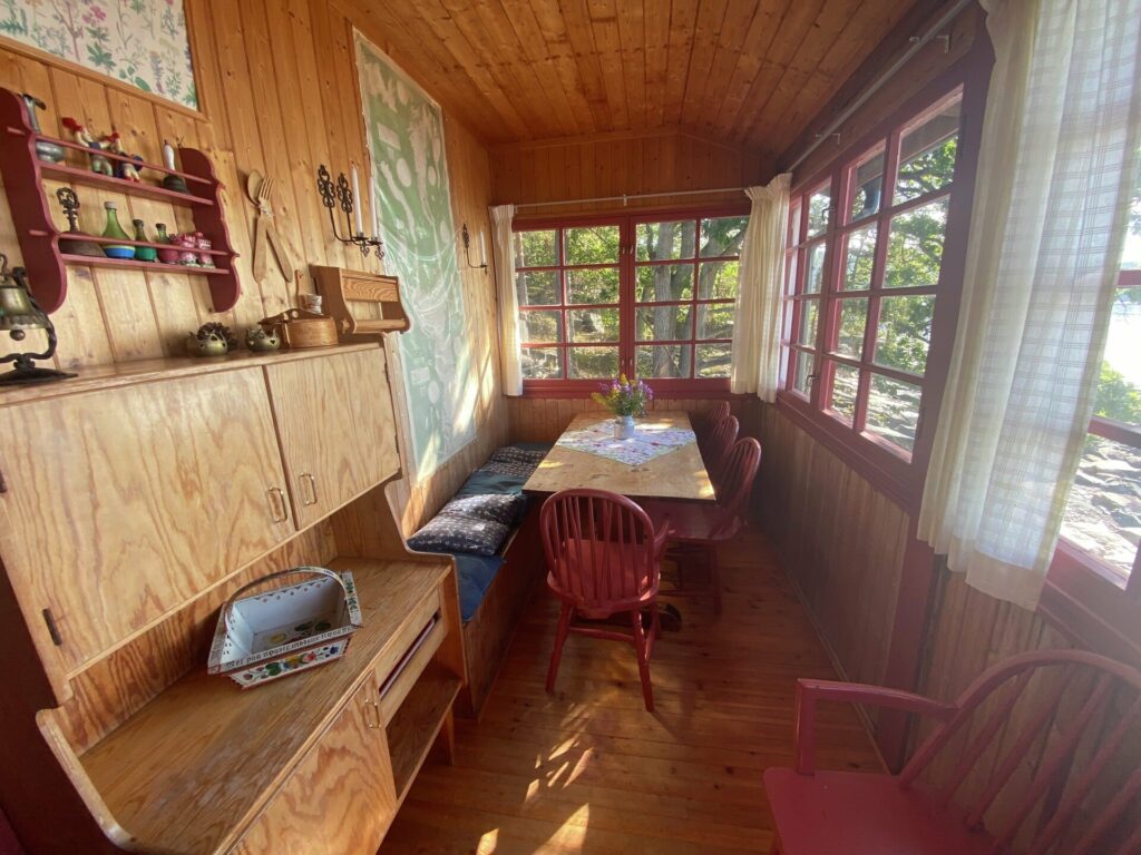 Utendørs var det én overhengende forutsetning for arbeidet med uteområdet: at alt kan ryddes vekk når sommeren er over. Slikt krever en god dose planlegging, men med kyndig hånd setter Ole i gang med å lage nye utemøbler for hånd. Det blir spesialtilpasset med bordben i forskjellige lengder, og ikke minst blir både bord og stoler sammenleggbare, så de kan vinterlagres under hytta.