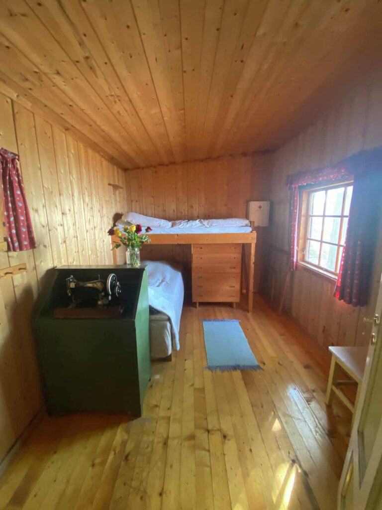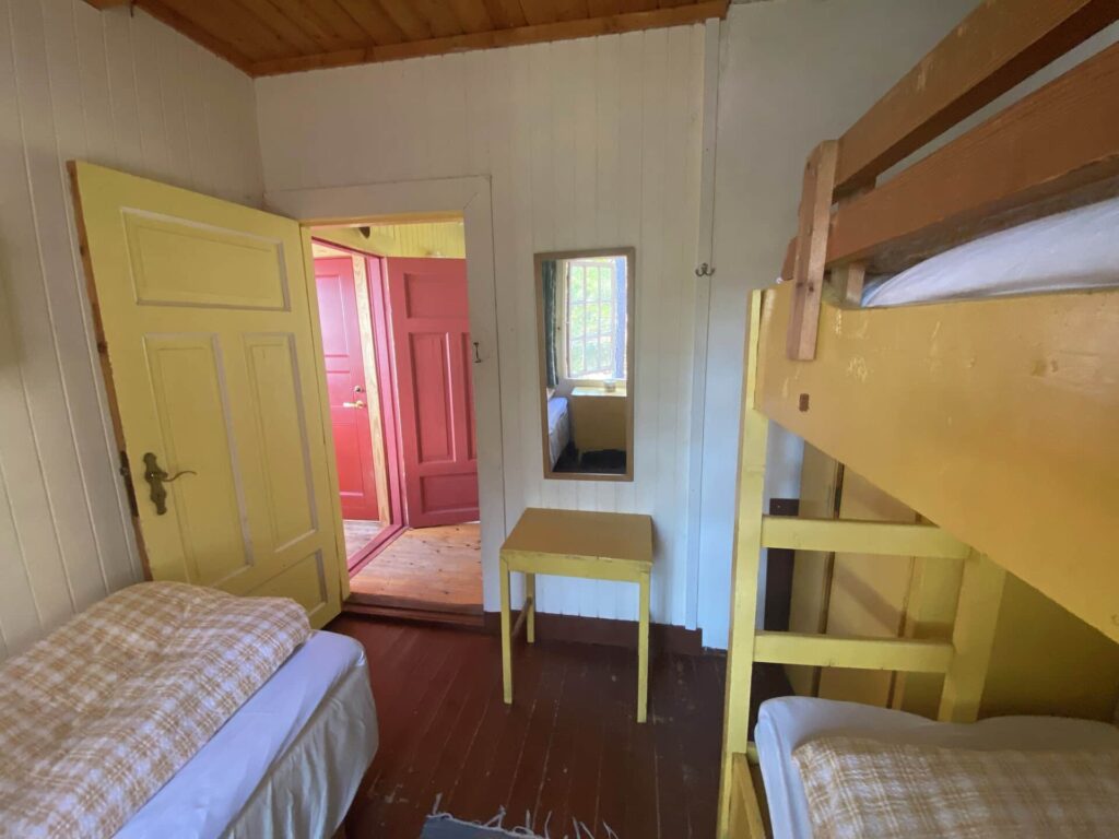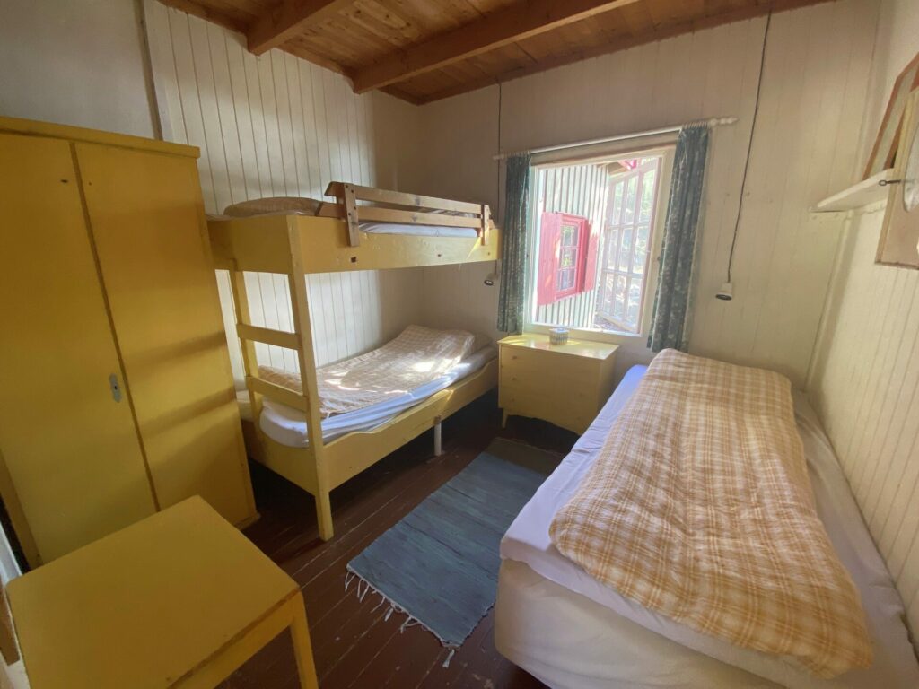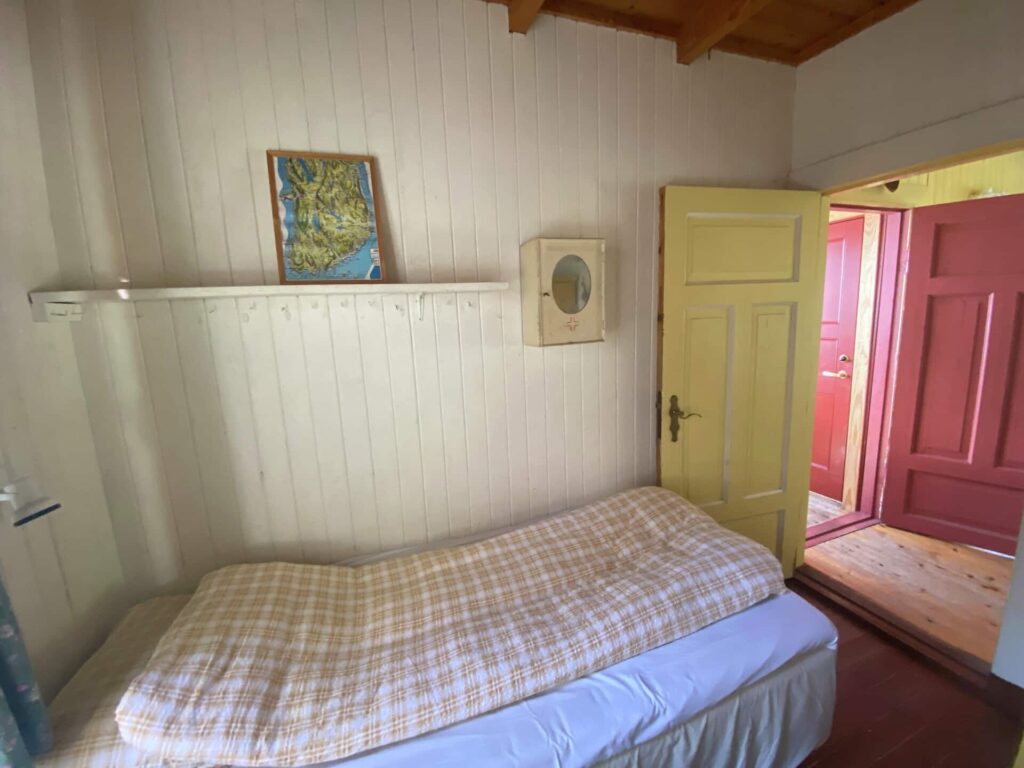 Siden hytta ligger ytterst på svaberget og bare brukes om sommeren, ønsker Halvor å hente inspirasjon fra The Hamptons på Long Island i USA. Det gjør han blant annet ved å bruke en av de lekreste tapetene han noen gang har jobbet med! En rålekker, mørk tapet med fiskebeinsmønster fører tankene på master bedroom til strå og siv man finner igjen på den amerikanske østkysten.