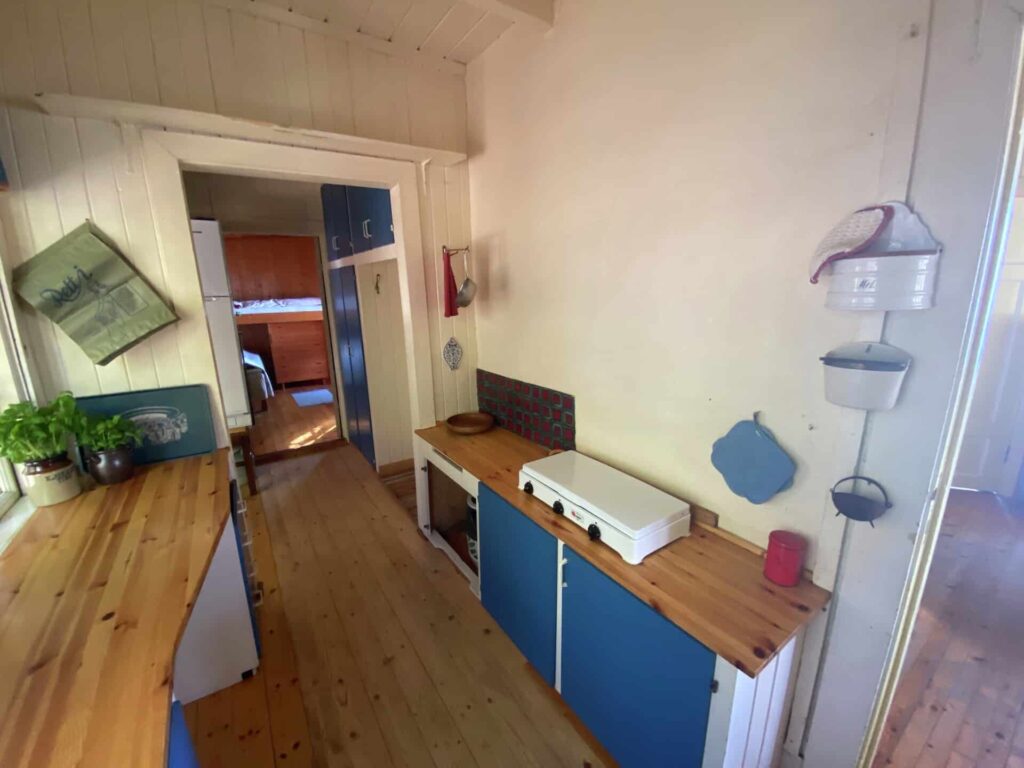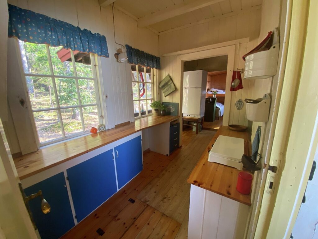 På de andre soverommene håndlager Ole nye, plassbygde køyesenger, mens Halvor maler dem i blå dongeri. Og siden det ikke var noen kjøkkentegning, kan Torkel skjære ut de eikeplatene han trenger for å lage plass til komfyr og kjøleskap på det nye hjørnekjøkkenet.