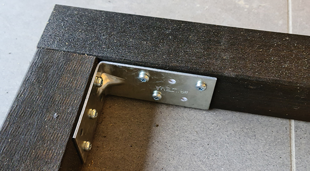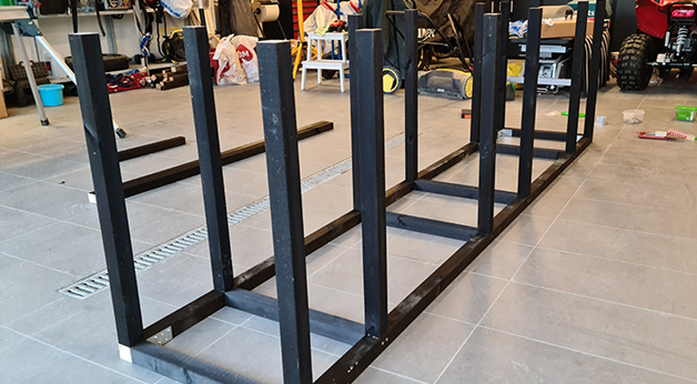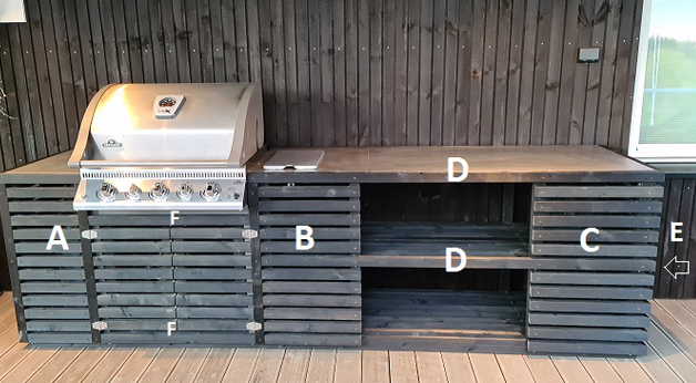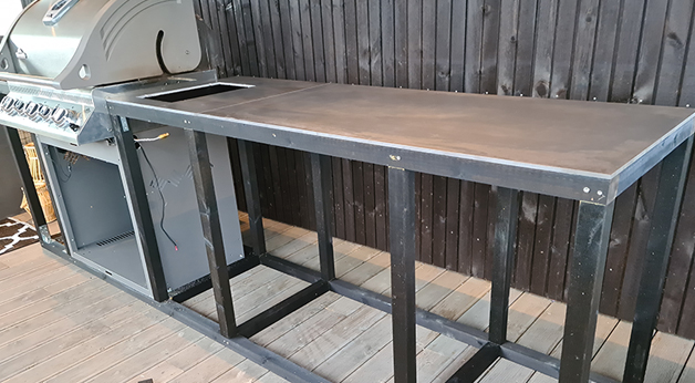 Først begynte vi med selve rammen og kappet 2 langsider og 2 kortsider. Hjørner ble forsterket med vinkler. Vi kappet også 12 vertikale deler som ble skrudd fast etter utformingen av de forskjellige delene av kjøkkenet. Her må du selvsagt ta utgangspunkt i din egen grill hvis den skal bygges inn. Vi kappet også delene til toppen og skrudde fast dette.