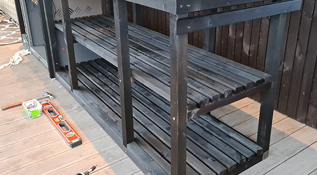 Vi kappet og skrudde fast 16 lekter som vi lagde 2 hyller av. Samt 4 stk. 45×45 til bæring av øvre hylle.