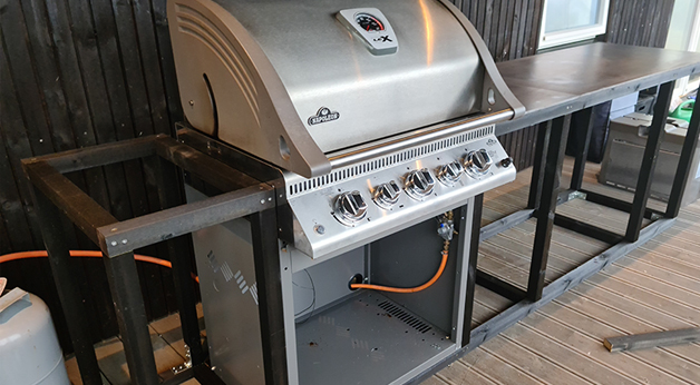 Her har vi fått på plass grillen! Husk at det må være litt avstand til vegg for å få åpnet lokket på grillen.
