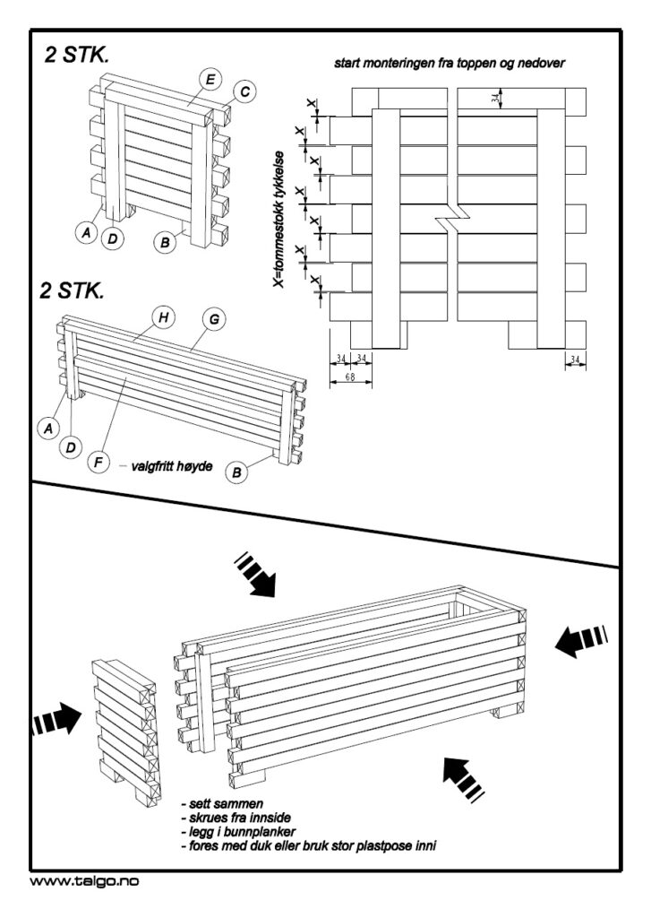 2) Lag to til, men med lekter D, H og F. Hvor du fester lekt F avgjør hvor dyp blomsterkassen blir.