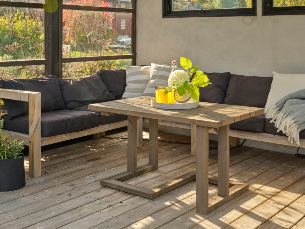 Det er lite her i verden som faktisk er helt vedlikeholdsfritt, selv om MøreRoyal sorterer under kategorien svært vedlikeholdsvennlig. Marte forteller at hun oljer de svarte terrassebordene for å friske opp fargen annethvert år, selv om dette ikke er nødvendig for å ivareta egenskapene til materialene. De naturfargede bordene får derimot være i fred så lenge som mulig – så de blir sølvgrå.