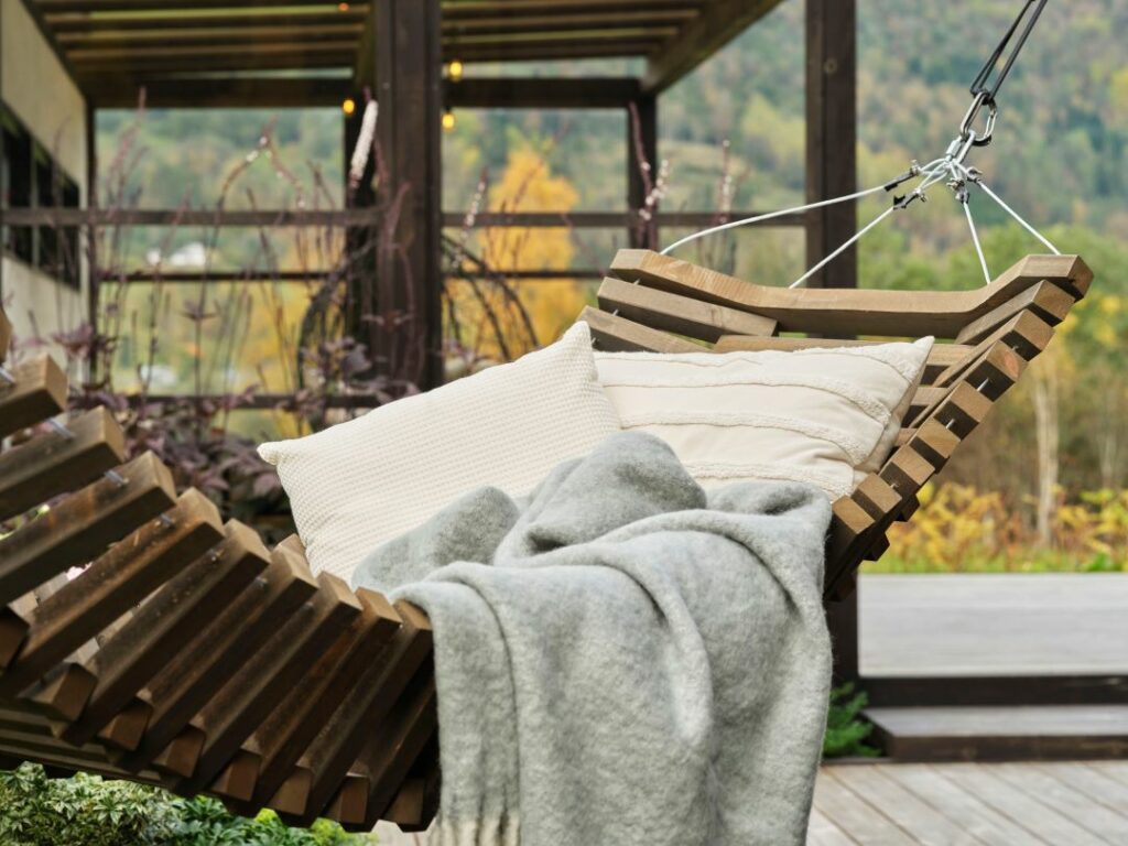 Mer MøreRoyal finner man i utemøblene. Både løse og plassbygde benker pryder uteområdet, men også bord og til og med hengekøyen kommer fra Talgø sitt sortiment. Noe på ordre, men det dreier seg like mye om gjenbruk av avkapp og rester.