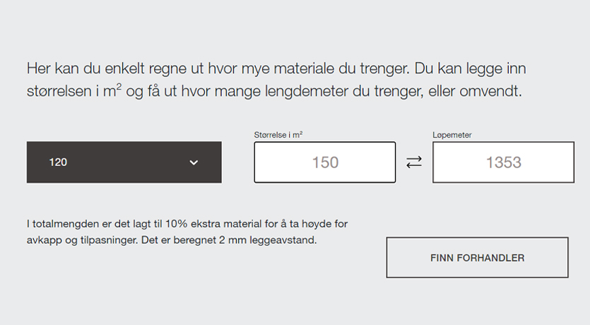 - Velg størrelse i kvadratmeter for å få lengdemeter – eller motsatt