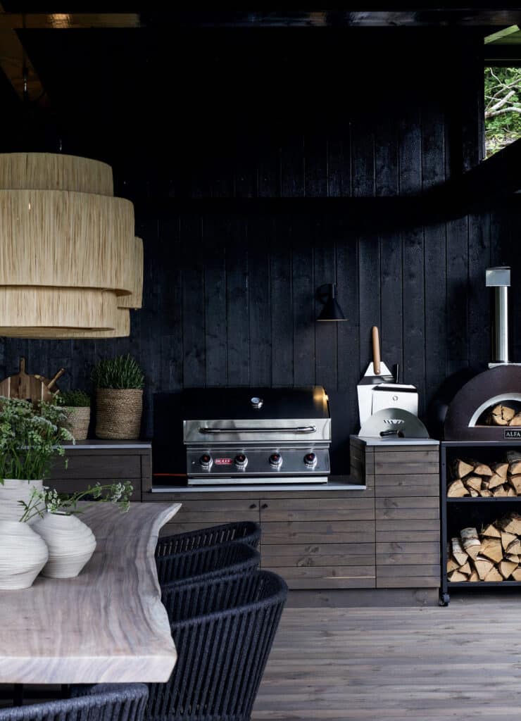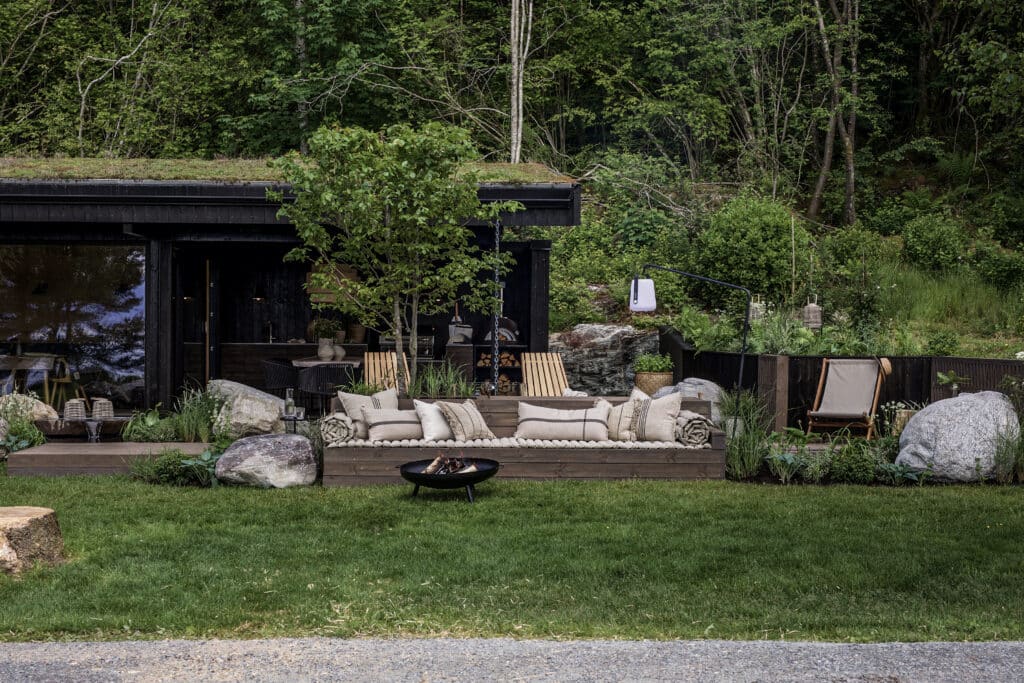 Designer Therese ønsker å dele den tomme hagen i flere soner, slik at familien har et sted å oppholde seg både i solen og på regnværsdager. Hun synes også det er viktig at utsikten blir ivaretatt og at bergene fra sjøen blir tatt igjen i hagen. Hun vil ha en naturlig overgang mellom hyttehagen og naturen i rundt, og henter derfor elementer fra skogen og havkanten – som ulike planter og store flotte steiner. Disse elementene gjør hagen levende og frodig, samtidig som utsikten og omgivelsene ved hytten blir ivaretatt. For at den fine utsikten ikke skal bli skjult, plasserer hun de ulike elementene i lavt terreng. Den store sofaen som er et allsidig møbel med flere bruksområder, plasseres helt fremst og litt lavere i terrenget. Sofaen fungerer som en romdeler og skiller hagen fra utekjøkkenet. I tillegg har den god sitteplass, inneholder store putekasser til oppbevaring og i sofaryggen er det plantet et fint tuntre. Den kalde betongplassen forvandler Therese om til et funksjonelt og flott utekjøkken med en lang kjøkkenbenk og spiseplass til hele familien. Da er det bare å tilberede fersk fangst fra havet på det flotte kjøkkenet, med hele familien samlet rundt bordet, i sin helt nye og frodige hyttehage.