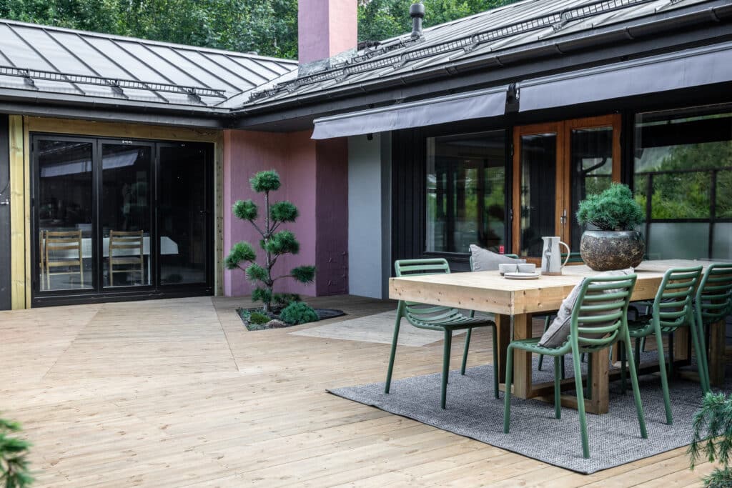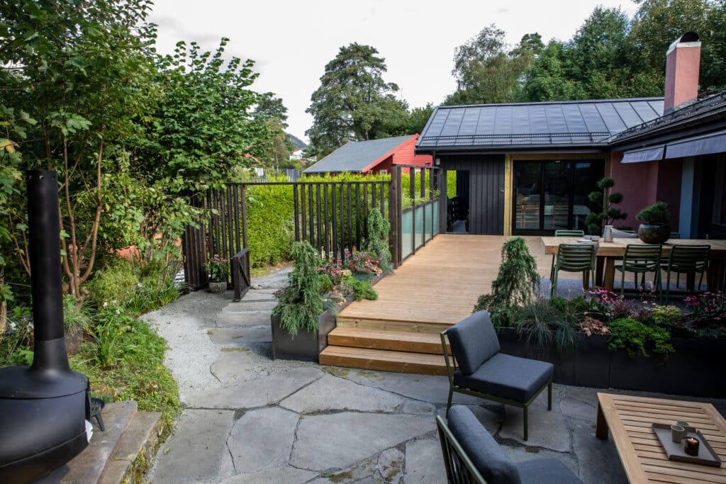 De fjerner den eksisterende smale terrassen ved huset, og bygger i stedet en ny og romslig terrasse med MøreRoyal Concise terrassebord i natur. Dette gir familien en brukervennlig og sosial sone med rikelig plass til langbord og gjester på besøk. Terrassebordene blir lagt i forskjellige retninger for å skape spenning og variasjon, og i terrassen feller de inn et bed hvor de planter et stilig og formklippet tre. Den resterende delen av uteområdet besto opprinnelig av overgrodde heller og et ujevnt underlag som ikke egnet seg for møbler. Designer Yvonne tar derfor den rette avgjørelsen ved å fjerne de gamle hellene og legge ned nye, for å skape et flatere og mer attraktivt område. Her er det nå plass til en fin sofagruppe med en MøreRoyal levegg, som gir en lun og avslappende atmosfære. For å få plass til de ulike sonene, fjerner de en del av de overvokste buskene, og gir samtidig nytt liv til den gamle steinovnen med en ny og funksjonell pizzaovn. Etter noen dager med opprydding og fornyelse av uterommet, blir den tidligere overgrodde hagen forvandlet til en inspirerende, velstelt og frodig hageoase hvor familien kan nyte hyggelig stunder alene eller i festlige lag med gjester.